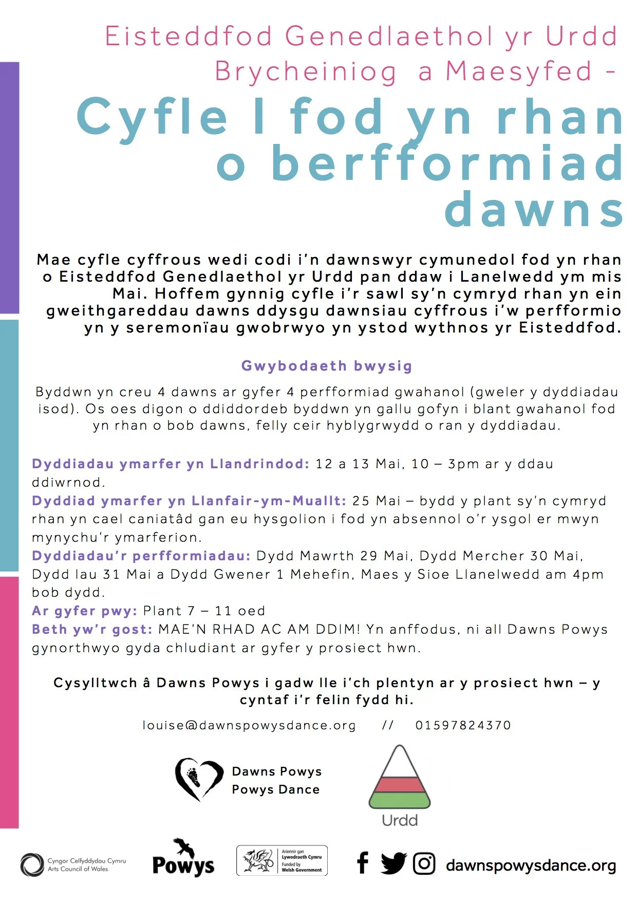 An Eisteddfod dance performance opportunity this May with Powys Dance, a chance for anyone aged 7 - 11 years to perform throughout half term on the National Eisteddfod stage!