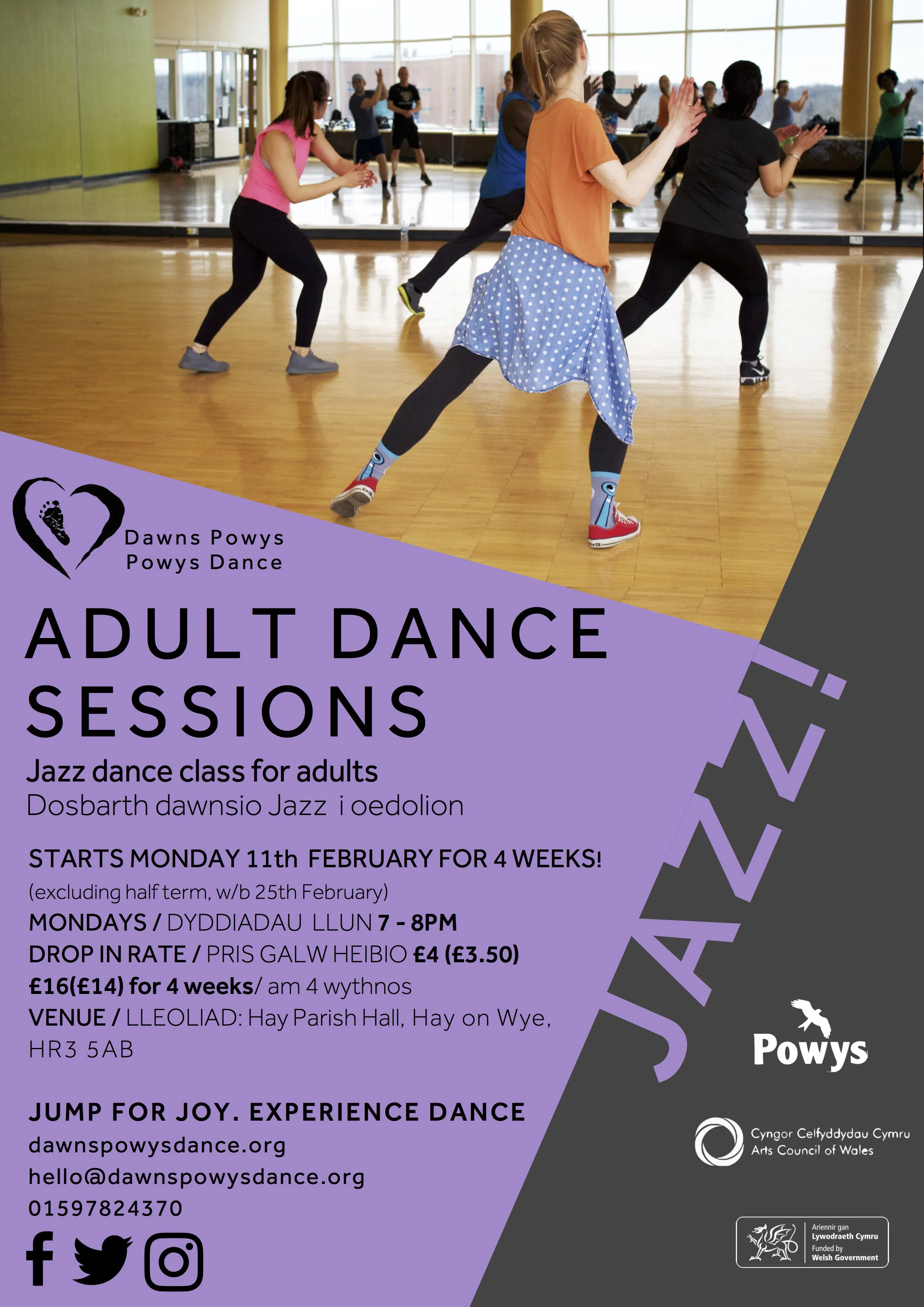 Our adult dance classes continue on Monday 11th February in Hay on Wye but we’re changing the style to Jazz! This class will be a combination of fun and upbeat warm ups, working on Jazz technique for all abilities. Carolyn will introduce you to the world of musical theatre jazz, expect kicks and flicks, fancy footwork and A LOT of fun!