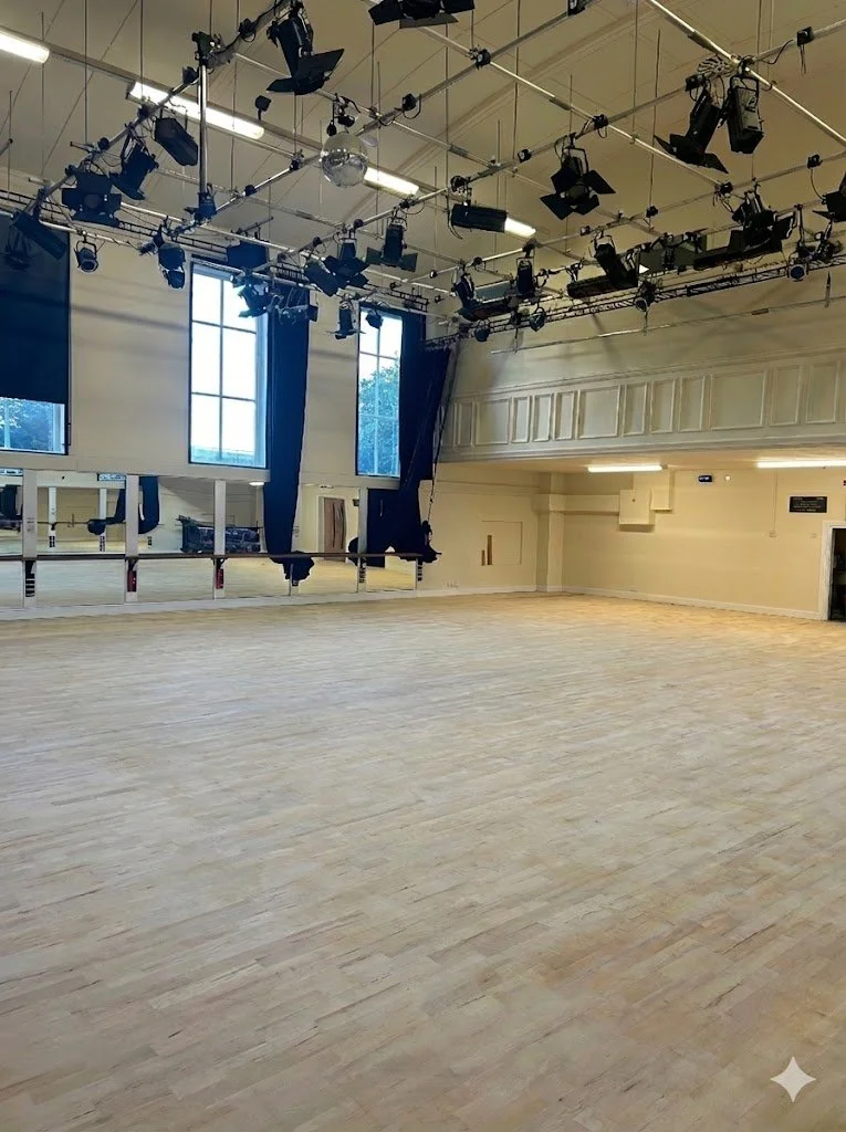 A bright dance studio with a wooden floor, long black curtains, mirrors and ballet barres. A light rigging is on the ceiling. A disco ball hangs in the middle.